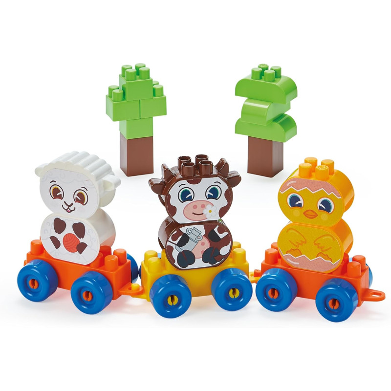 - Animaux et Train : Inclut des pièces spécifiques pour monter 3 animaux de la ferme et un train complet avec locomotive et 3 wagons.