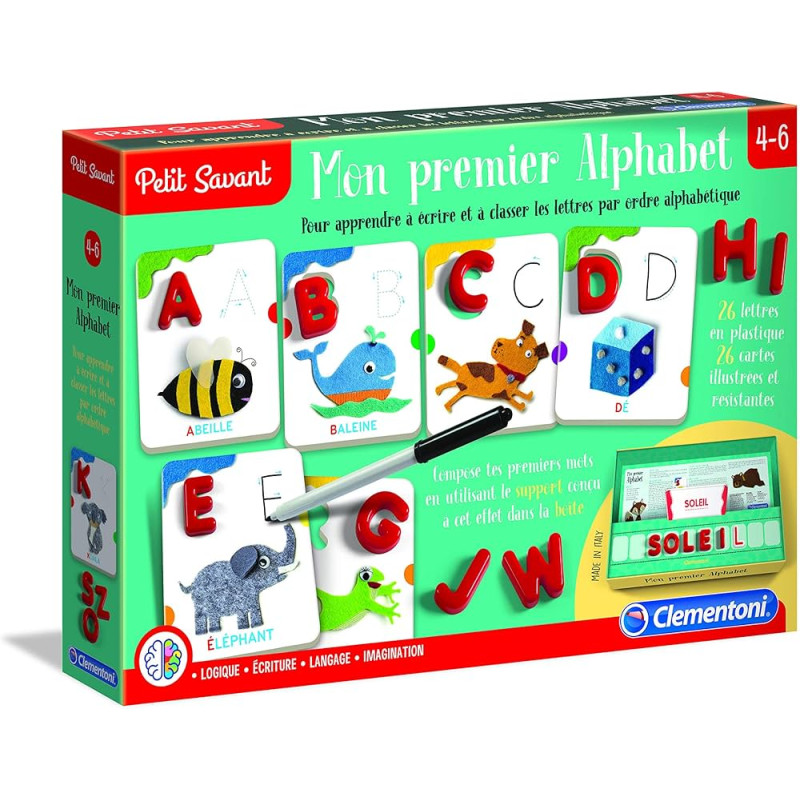 26 cartes illustrées sur lesquelles apparaissent une lettre à tracer et un sujet commençant par l'une des lettres de l'alphabet. L'enfant devra retrouver la bonne lettre à encastrer parmi les 26 lettres en plastique rouge fournies, tracer la lettre avec le feutre effaçable et lire le mot en bas de la carte. Il pourra aussi reconstituer l'alphabet en alignant côte à côte toutes les cartes. Dès 4 ans.