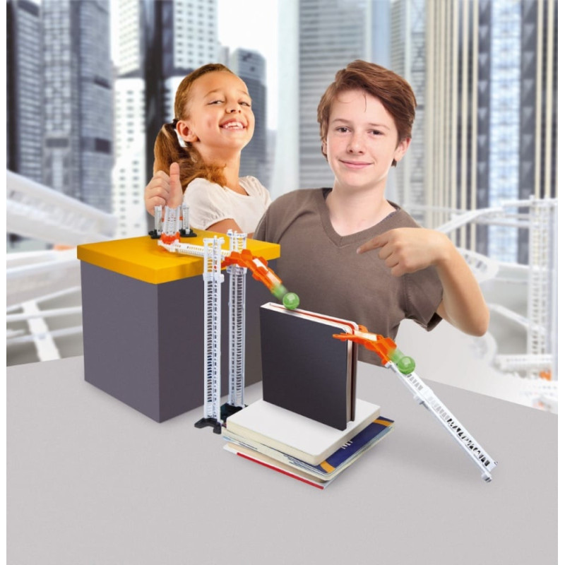 Contient de nombreuses pièces spéciales pour créer des circuits sans fin, qui peuvent également être personnalisés avec des objets ménagers pour une créativité sans limite. Défiez les lois de la gravité avec l'entonnoir, dupliquez les itinéraires avec les croisements et créez des effets spéciaux incroyables avec les pistes croisées. Lorsque la bille atteint l'arrivée... le jeu recommence grâce au système d'ascenseur manuel ! Le manuel aidera les enfants à comprendre les principes de la physique, tout en donnant des idées pour construire des circuits avec des niveaux de difficulté croissants. Dès 8 ans.