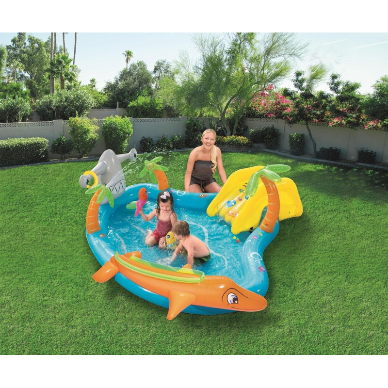 Dimensions de l'air de jeu Vie de la Mer : 280 x 257 x 87 cm. Soupapes de sécurité. Vinyle robuste testé en usine. Comprenant 4 balles de jeu à faire rouler de haut en bas le long de la rampe gonflable et 1 anneau gonflable à lancer ! Toboggan amovible avec cordes et œillets incorporés. Coussin gonflable sur le sol de la piscine pataugeoire pour plus de confort. Comprenant 3 poissons gonflables. Le pulvérisateur d’eau se fixe sur le tuyau d’arrosage. Amusant pour les enfants. Patch de réparation inclus. Capacité en eau : 273 L. Évacue l’eau de la piscine pataugeoire avec la vanne de vidange facile à utiliser Contenu : une piscine pataugeoire, un toboggan, 3 poissons gonflables, 4 balles de jeu, 1 anneau à lancer, patch de réparation. Dès 2 ans.