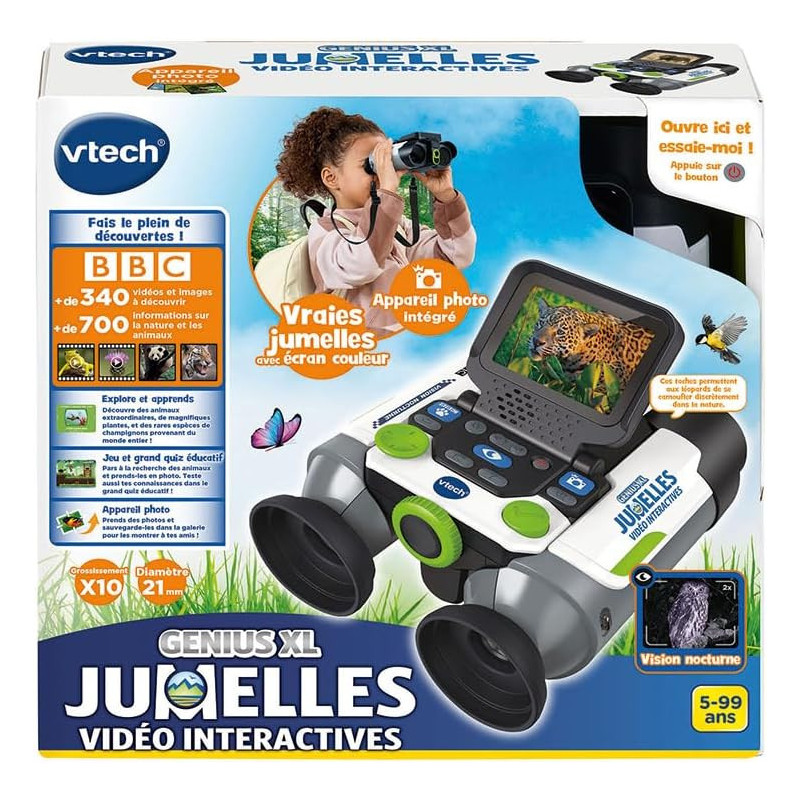 De vraies jumelles 10 x 21 avec écran couleur de 2,4" pour un voyage au cœur de la nature et de l'observation animalière ! 6 modes de jeux inclus pour observer et s'amuser. Capacité de stockage : jusqu'à 50 photos sur la mémoire interne et possibilité d'étendre la mémoire avec carte-micro SD non incluse. Tour de cou fourni. Arrêt automatique et réglage du volume sonore. Fonctionne avec 4 piles LR06 fournies. Dès 5 ans.