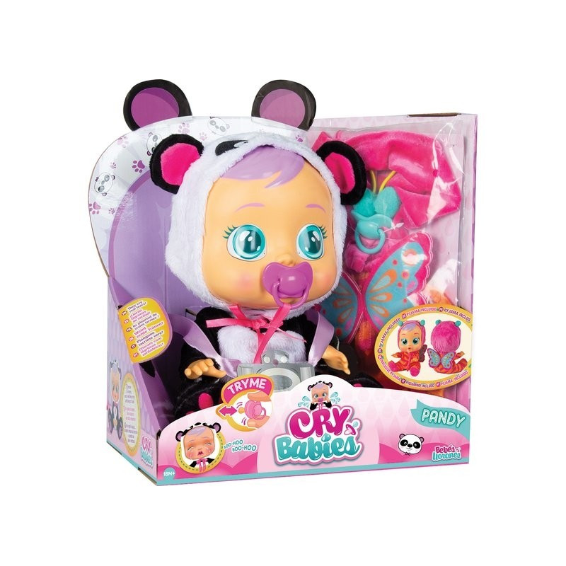 Contient un poupon interactif Cry Babies Panda vêtu d'un pyjama interchangeable, une tétine, et un second pyjama au motif papillon. Cry Babies Pandy pleure de vraies larmes quand on lui enlève sa tétine. Cry Babies Pandy est adorable mais très capricieux ! Quand on leur retire sa tétine, il sanglote et pleure de vraies larmes ! Ton Cry Babies réclame ton attention : prends soin de lui, câline-le, sèche ses larmes et redonne-lui sa tétine pour qu'il arrête de pleurer. Les pyjamas sont doux et peuvent se laver à la machine. Piles incluses.
